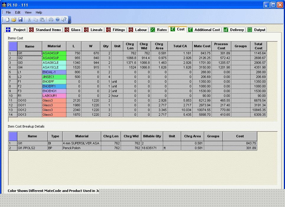 | Mate.Cost | Shows total material cost for products, glass, lineal, resource and fittings items. |