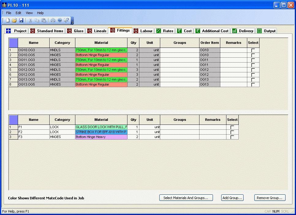 The Fittings page is used to input fitting items details. As is the case with Glass and Lineal items, the this screen is also divided into two sections - one on top contains the fitting items which are defined in the products, while the bottom section will have additional fitting items.