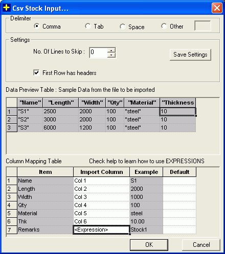 Expression : If you select expression, you can import multiple columns into a single field by using the column name prefixed by $, in the Default column. For instance specifying $1-$2 will make the data in the field equal to the value of col1 and col2. You can also use $0 which is replaced by the line number (for generating unique names). This could be very useful if you want to automatically name the imported rings/ discs as Material-Length combination. If the material column is 2, and length column is 3, this can be accomplished by simply setting the value of default to $2-$3.